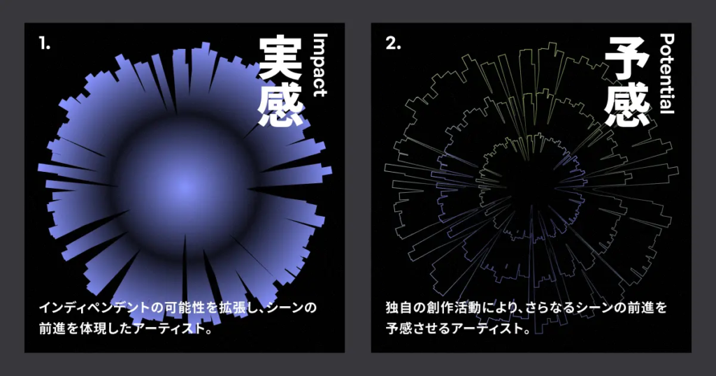 最もシーンの前進に「実感(Impact)」または「予感(Potential)」をもたらしたインディペンデントアーティストを、インディペンデントアーティストの投票により100組選出。