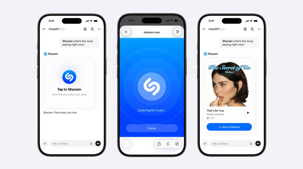 ChatGPTにはすでにSpotifyおよびApple Musicとの連携が導入されており、プレイリストの作成や音楽・ポッドキャストのレコメンドに対応している。これに対しShazamの統合は曲の識別に特化したもので、三者それぞれ異なる役割を担う形となっている。Shazamにとっては、2024年のTicketmasterとの連携、2023年のYouTube・Instagram・iOS版TikTokの動画コンテンツからの音楽識別機能追加に続く、パートナーシップ拡張の最新事例となる。